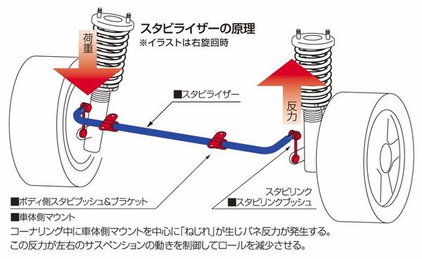 ■スタビライザーはアンチロールバーともよばれ旋回時のロール(車体の傾き)を抑えるパーツです。